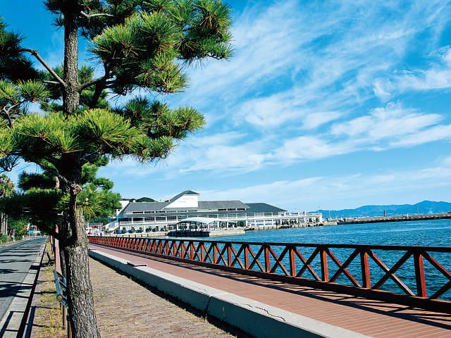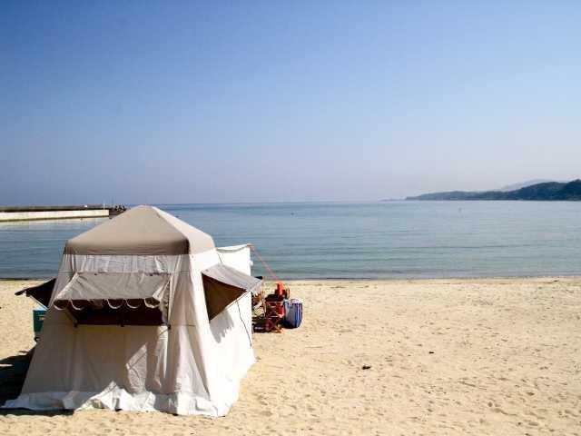 白石などの小石がびっしりと敷きつめられた海岸。浜辺から見る夕日が美しいことでも有名で、水平線の彼方、瀬戸内海に沈むロマンティックな景色が堪能できる。
