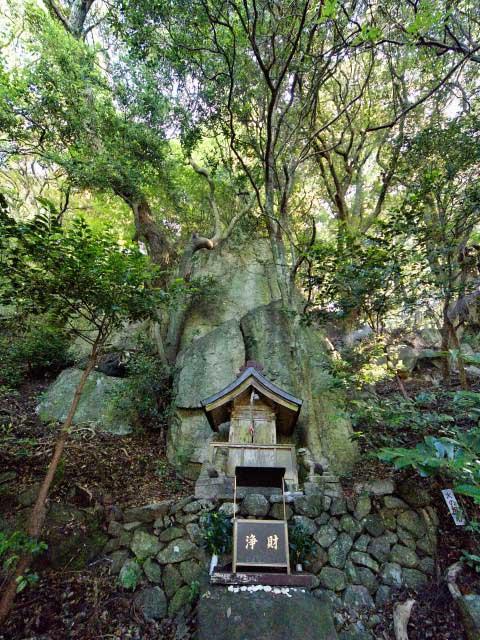 国生み神話で最初に出来た山とされる先山。その頂上付近にある神社で巨石を御神体とし、天照大神を祀っている。千光寺近くの茶屋横から林道を進み、「十六丁」の三叉路を右折すると鳥居が見える。
