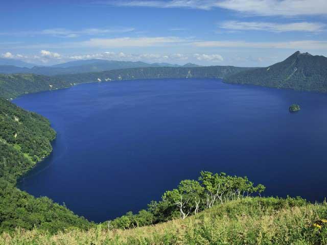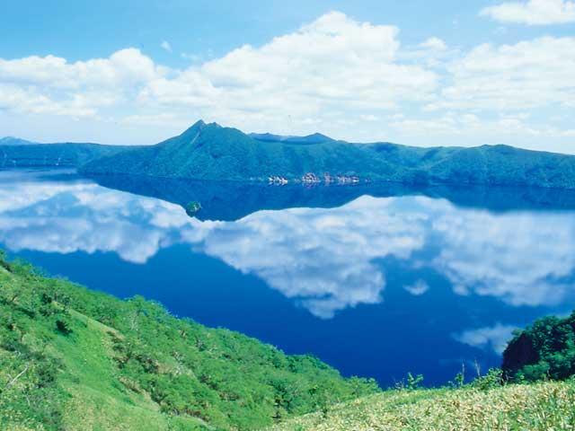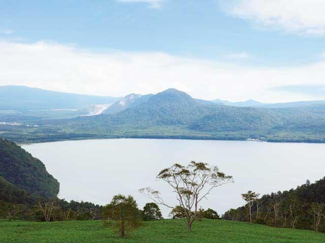 火山性の陥没によりできたカルデラ湖、周囲約57km、最深部は約125mもあり、カルデラ湖としては日本最大、世界でも有数の規模を誇る。湖畔には温泉やキャンプ場などがある。