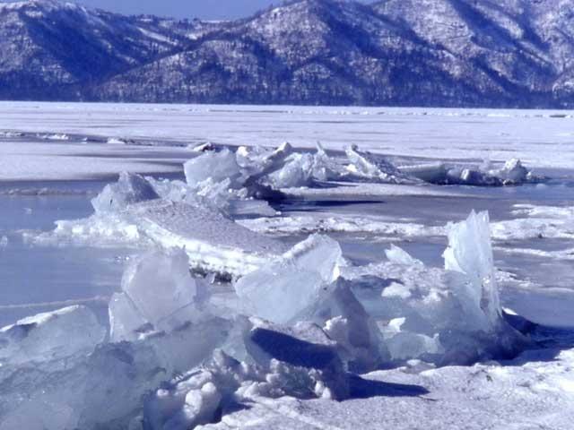 全面氷結した屈斜路湖で2~3月初旬にかけてみられる、山脈状にせり上がる氷の造形美。氷の道は全長10km、高さ2メートルに及ぶこともある。
