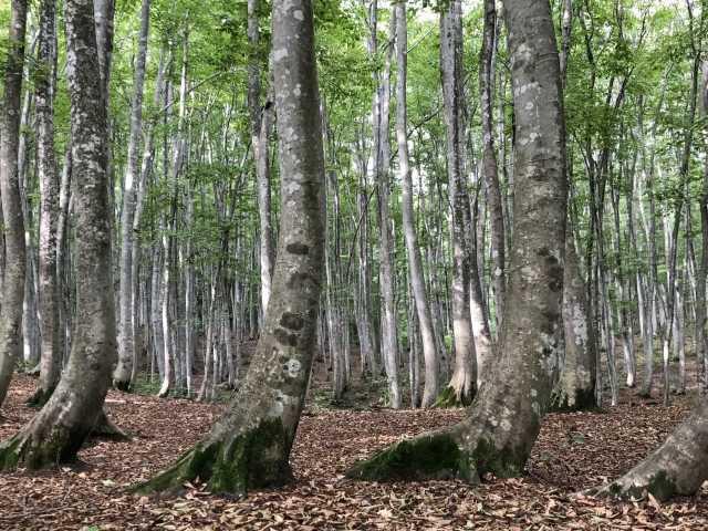 立ち姿がじつに美しい、樹齢約90年のブナが生い茂る松之山の林。周辺より気温が2度ほど低いといわれている。自由に散策できるので、きれいな空気を吸いに出かけてみよう。