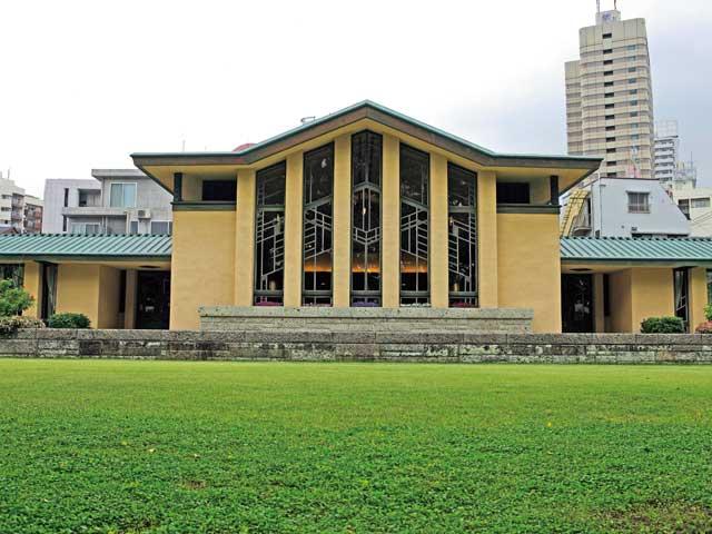 建築界の巨匠、アメリカのフランク・ロイド・ライトが設計した学校の旧校舎。窓枠や桟を組み合わせてステンドグラス風に仕上げた窓が有名。現在は重要文化財として一般公開されている。