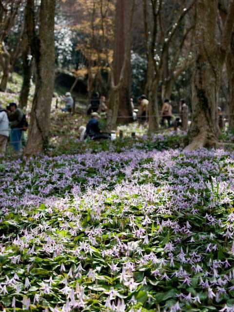 香嵐渓の中心にそびえる標高254mの飯盛山は、カタクリの群生地としても知られる。5000平方メートルという広さに群生するカタクリが見られる。