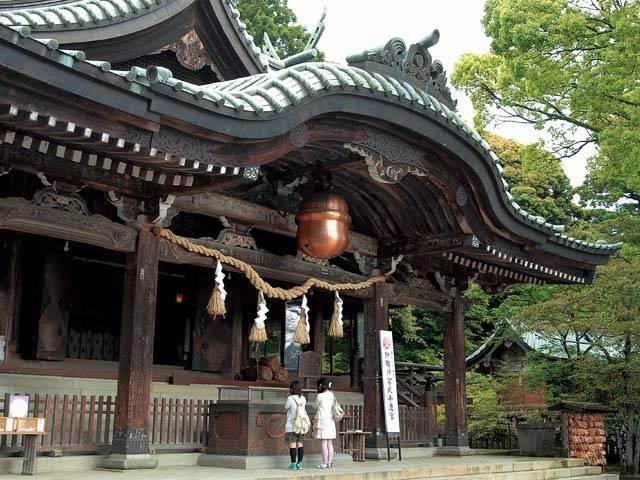 約1500年の歴史を誇る古社で、1964年(昭和39)年に泊崎へ遷された。境内には高さ10m以上の大鳥居がそびえ立ち、諸願成就の神として崇められる猿田彦大神を祀る。