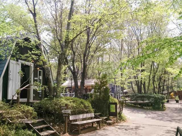 雑木林を生かした場内はとても落ち着いた雰囲気。ログキャビンや、日帰り向けのバーベキュー場もある。