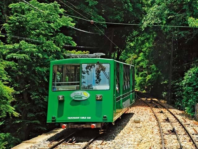 筑波山神社左側の宮脇駅と山頂駅を結ぶ日本有数のケーブルカー。高低差約500m、所要約8分。四季折々の草花や、そびえる大木、奇石などが織りなす風景も楽しめる。