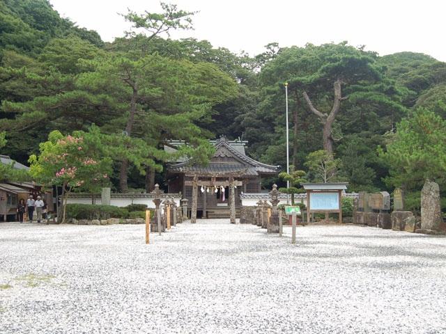海幸彦、山幸彦の神話で有名な彦火火出見尊と豊玉姫命を祀る。海の守護神として信仰を集めていて、浅茅湾に二つの鳥居が立つ。干潮時には第一鳥居まで歩いて行けるが、満潮時には社殿近くまで海水が上がる。