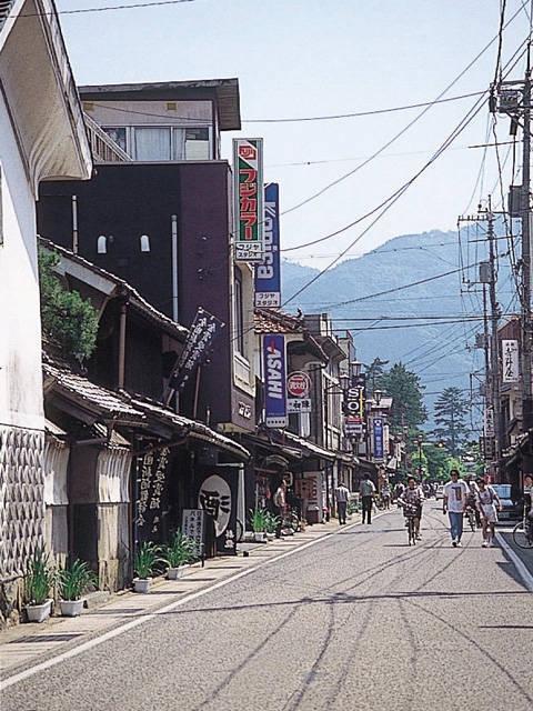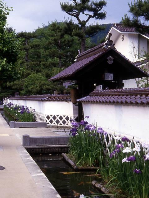 津和野観光のメインストリート。通りに面して白い土塀と堀割が続く。堀割には色鮮やかな鯉が泳ぎ、5月下旬から6月中旬ごろには、ハナショウブが咲く。立派な門構えの武家屋敷も見られる。