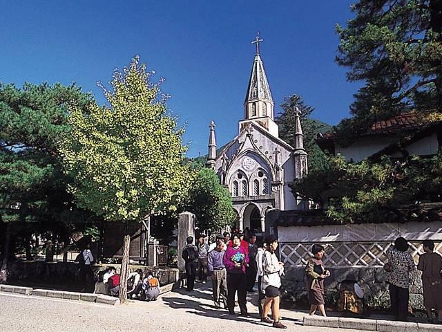 昭和6(1931)年、ドイツ人シェーファによって建てられたゴシック建築の教会。武家屋敷が立ち並ぶ殿町にあり、木造モルタル造りの建物で、内部のステンドグラスが美しい。