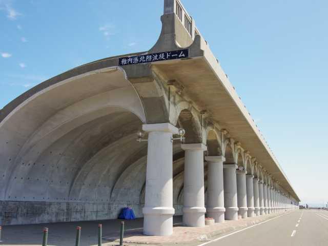 総延長427mの防波堤は、稚内ならではの強風、高波による被害を少なくするために造られた。古代ローマ建築を思わせる重厚で美しいデザインで、街を守る。