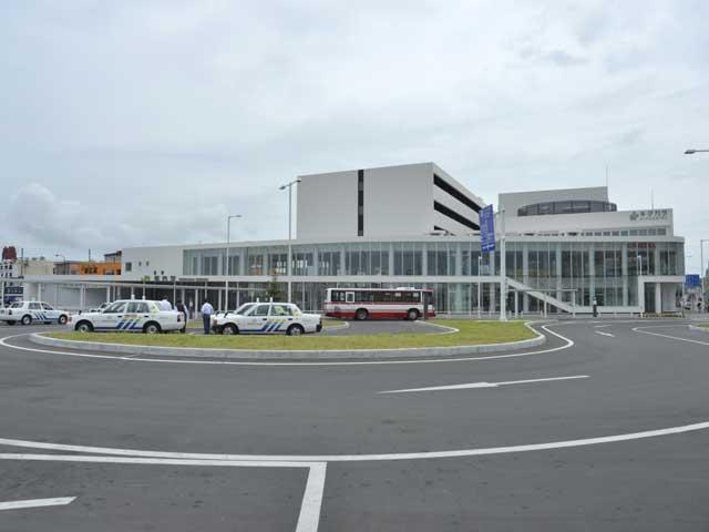 カフェやショップ、シネコンなどが入居する複合ビル「キタカラ」内、日本最北端にある道の駅。駐車場内には、電気自動車急速充電器が設置されている。