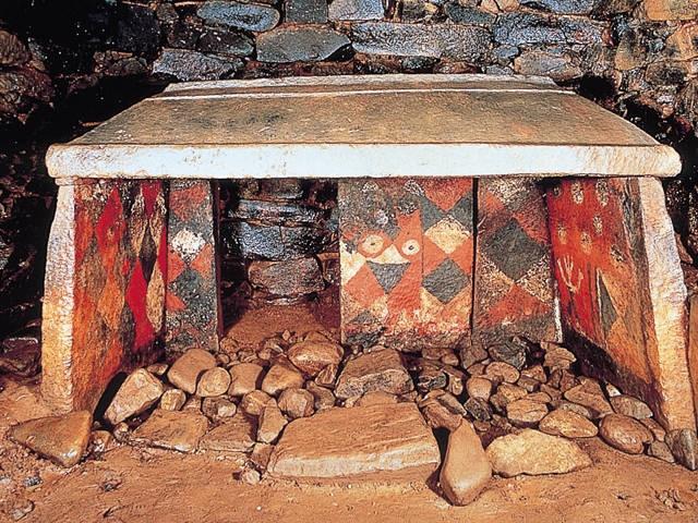 石屋形(石棺)に描かれた二つの円が乳房に見えることから、「チブサン」と呼ばれる装飾古墳。カラフルな壁画は、幾何学模様から人物像に移り変わる過程を示している。