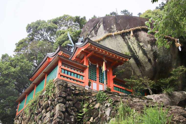 五百数十段の石段を登った山上には御神体のゴトビキ岩が祀られています。毎年2月6日には、2,000人近い男性が松明を持って石段を駆け下りる勇壮な「お燈祭り(おとうまつり)」が催されます。
