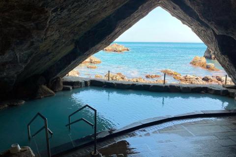 那智勝浦温泉の「ホテル浦島」にある天然洞窟内の温泉。海岸の岩が荒波に浸食されてできた洞窟は、間口25m、奥行50m、高さ15m。日の出や磯に打ち寄せる荒波などの絶景を眺めながら極上の湯浴みを楽しめます。