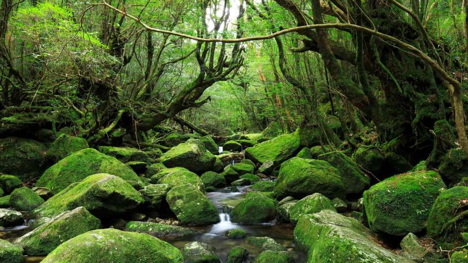 太鼓岩へのコースの途中には、数百種の苔に覆われた幻想的な光景が広がる「苔むす森」があり、この辺りは、映画『もののけ姫』のモデルとなったといわれています。