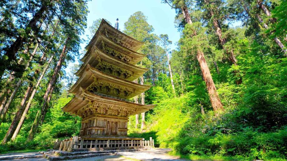 長い軒は飛び立つ白鳥の翼のように美しく、優美な姿でそびえ立つ高さ29mの五重塔。平安時代に平将門が建立し、約600年前に再建されたと推定されています。山形県の建造物では唯一国宝に指定。四季を通して風景にマッチし、雪の降り積もる塔も人気があります。近くには樹齢約1,000年の「爺杉」という巨木があります。