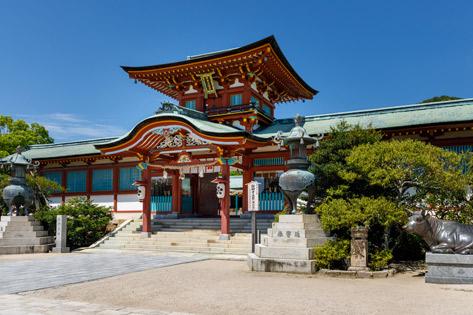 正月の初詣や早春の梅まつりをはじめ、11月には西日本屈指の荒祭りとして知られる御神幸祭(裸坊祭)も開催。1年を通じて多くの参拝者が訪れる境内には、抹茶とお菓子をいただける茶室や歴史館もあります。