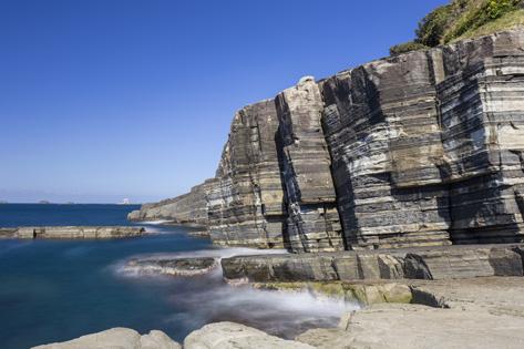 地殻変動によるマグマの熱の影響を受けて1400万年前に誕生したホルンフェルス。黒色と淡灰色の岩が美しい縞模様を成す高さ約12メートルの断崖は、「日本の地質百選」や「21世紀に残す日本の風景遺産100選」にも選ばれています。断崖周辺は遊歩道が整備され、散策を楽しめます。