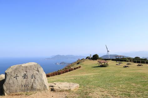 日本海に面した向津具(むかつく)半島の付け根部の頂上に広がる、標高333メートルの草原の地。眼下には日本海に浮かぶ島々や、果てしなく広がる海と空の大パノラマが展開しています。