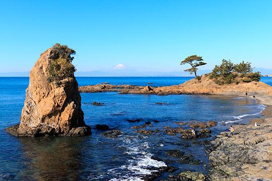 三浦半島 秋谷の海岸にある、高さ約12メートル、周囲約30メートルの巨岩「立石」をシンボルにした景勝地。江戸時代の絵師・初代歌川広重が「相州三浦秋屋の里」を描いたことでも有名です。特に、富士山を背景にした眺めが素晴らしく、昼間はもちろん、夕暮れの幻想的な美景は一見の価値あり。静かな海辺の散策スポットとしても人気です。