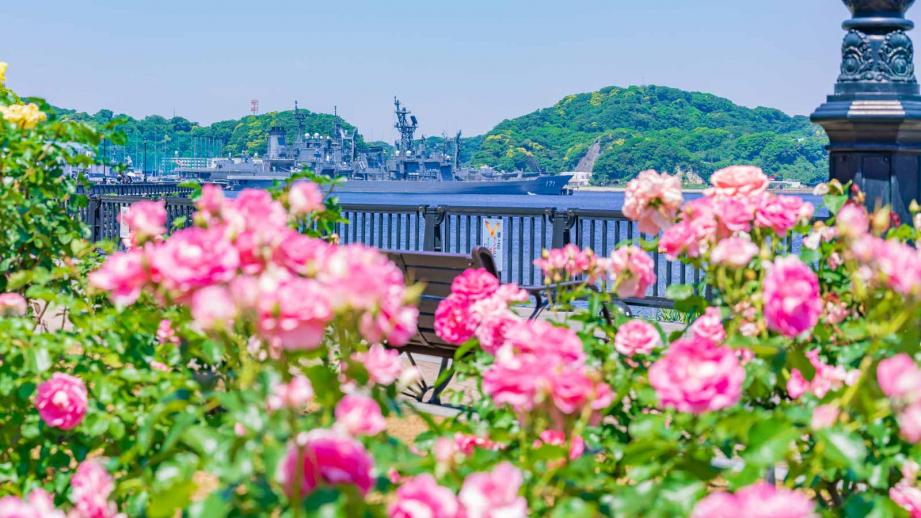 平成13年末にフランス庭園様式を取り入れてリニューアルした旧臨海公園。対岸には横須賀製鉄所跡地を望み、その建設に貢献したフランス人技師ヴェルニーと、当時の勘定奉行小栗上野介忠順の胸像が立ちます。約1,400株のフランス品種中心のバラが植栽され、海に面したボードウォークは潮風を感じながら散策できる人気スポットです。