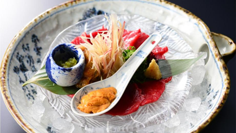殿湯(朝)白糸の湯 木曽の五木を使用した内湯 「食通のご主人が信州特産の食材を中心にひとつひとつ吟味。馬刺しにウニをトッピングするなど独創的な会席料理にお酒が進みます。一品一品吟味した食材を、お酒の合う料理にして供されます。