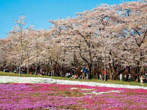 手前には満開の桜と朱色の五重塔、その奥に広がる街並みと雄大な裾野を広げた富士山。絵葉書やポスターなどでもよく目にするこの絶景が望めるのが、富士吉田市の「新倉富士浅間(あらくらふじせんげん)神社」です。