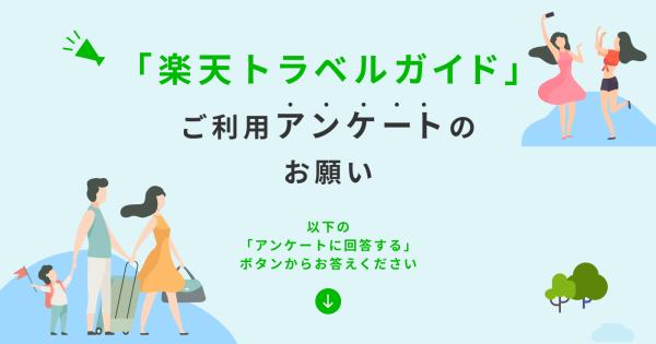 「楽天トラベルガイド」ご利用アンケートのお願い 全国 2024/06/03 平素は楽天トラベルをご利用頂きどうもありがとうございます。 「楽天トラベルガイド」では、紹介する旅行情報がより一層皆様のお役に立ちますよう、アンケートのご協力をお願いしております。 お手数ではございますが、以下の「アンケートに回答する」ボタンよりご回答くださいませ。