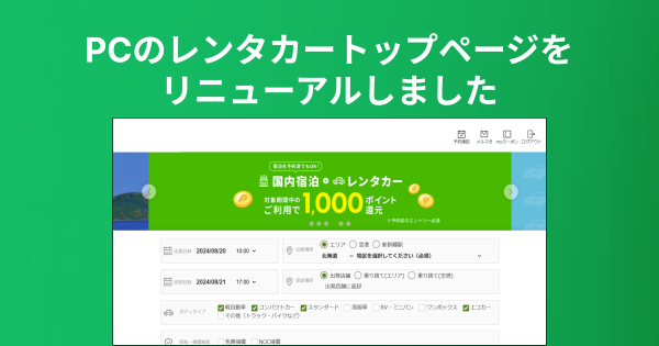PCのレンタカートップページをリニューアルしました 2024/08/21 楽天トラベルでは、お客さまより頂いたご意見・ご要望を真摯に受け止め、より良いサービスを提供できるよう、日々改善に取り組んでいます。このページでは、お客さまの声をかたちにした改善事例の一部をご紹介いたします。