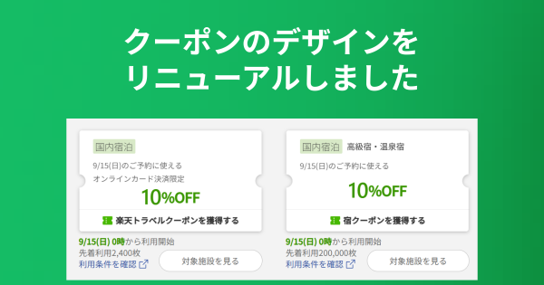 クーポンのデザインをリニューアルしました 2024/09/18 楽天トラベルでは、お客さまより頂いたご意見・ご要望を真摯に受け止め、より良いサービスを提供できるよう、日々改善に取り組んでいます。このページでは、お客さまの声をかたちにした改善事例の一部をご紹介いたします。