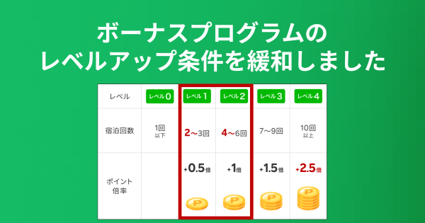ボーナスプログラムのレベルアップ条件を緩和しました 2024/11/05 楽天トラベルでは、お客さまより頂いたご意見・ご要望を真摯に受け止め、より良いサービスを提供できるよう、日々改善に取り組んでいます。このページでは、お客さまの声をかたちにした改善事例の一部をご紹介いたします。