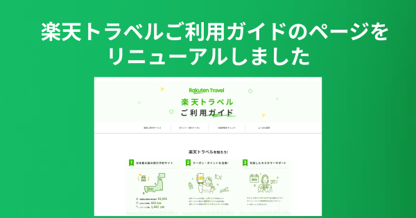 楽天トラベルご利用ガイドのページをリニューアルしました 2025/01/22 楽天トラベルでは、お客さまより頂いたご意見・ご要望を真摯に受け止め、より良いサービスを提供できるよう、日々改善に取り組んでいます。このページでは、お客さまの声をかたちにした改善事例の一部をご紹介いたします。