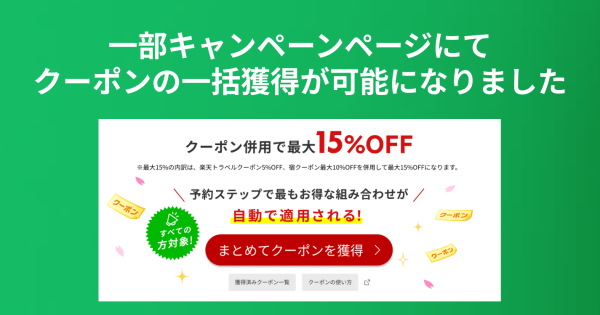 一部キャンペーンページにてクーポンの一括獲得が可能になりました 2025/02/19 楽天トラベルでは、お客さまより頂いたご意見・ご要望を真摯に受け止め、より良いサービスを提供できるよう、日々改善に取り組んでいます。このページでは、お客さまの声をかたちにした改善事例の一部をご紹介いたします。