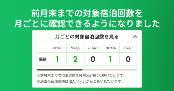 ボーナスプログラムページにて前月末までの対象宿泊回数を月ごとに確認できるようになりました 2025/04/23 楽天トラベルでは、お客さまより頂いたご意見・ご要望を真摯に受け止め、より良いサービスを提供できるよう、日々改善に取り組んでいます。このページでは、お客さまの声をかたちにした改善事例の一部をご紹介いたします。