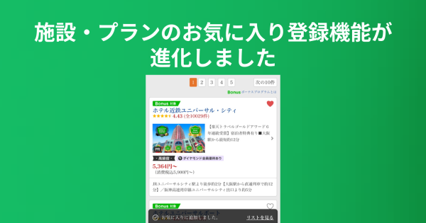 施設・プランのお気に入り登録機能が進化しました 2025/05/21 楽天トラベルでは、お客さまより頂いたご意見・ご要望を真摯に受け止め、より良いサービスを提供できるよう、日々改善に取り組んでいます。このページでは、お客さまの声をかたちにした改善事例の一部をご紹介いたします。