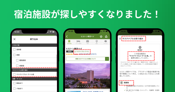 サステナブルな取り組みをしている宿泊施設が探しやすくなりました 2023/01/13 楽天トラベルでは、お客さまより頂いたご意見・ご要望を真摯に受け止め、より良いサービスを提供できるよう、日々改善に取り組んでいます。このページでは、お客さまの声をかたちにした改善事例の一部をご紹介いたします。