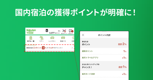 国内宿泊の獲得ポイントが分かりやすくなりました 2023/03/10 楽天トラベルでは、お客さまより頂いたご意見・ご要望を真摯に受け止め、より良いサービスを提供できるよう、日々改善に取り組んでいます。このページでは、お客さまの声をかたちにした改善事例の一部をご紹介いたします。