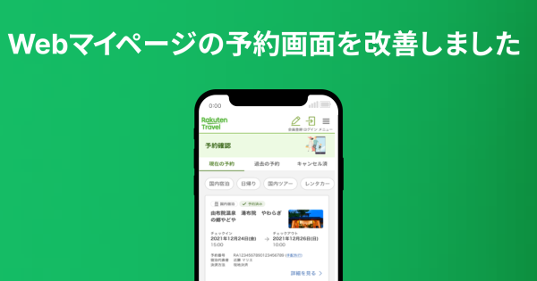 Webマイページの予約画面を改善しました 2023/05/16 楽天トラベルでは、お客さまより頂いたご意見・ご要望を真摯に受け止め、より良いサービスを提供できるよう、日々改善に取り組んでいます。このページでは、お客さまの声をかたちにした改善事例の一部をご紹介いたします。