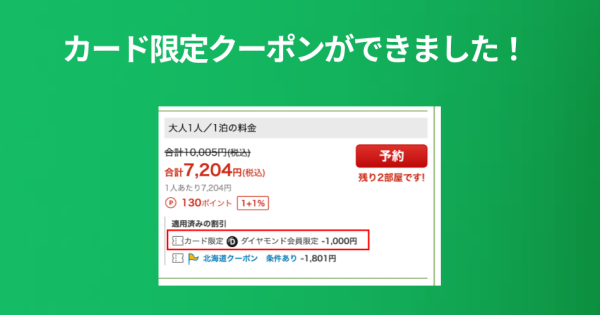 検索結果ページにクレジットカード限定クーポンが発行されるようになりました 2023/06/14 楽天トラベルでは、お客さまより頂いたご意見・ご要望を真摯に受け止め、より良いサービスを提供できるよう、日々改善に取り組んでいます。このページでは、お客さまの声をかたちにした改善事例の一部をご紹介いたします。