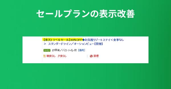 セールプランの割引率が分かりやすくなりました 2019/03/25 楽天トラベルでは、お客さまより頂いたご意見・ご要望を真摯に受け止め、より良いサービスを提供できるよう、日々改善に取り組んでいます。このページでは、お客さまの声をかたちにした改善事例の一部をご紹介いたします。