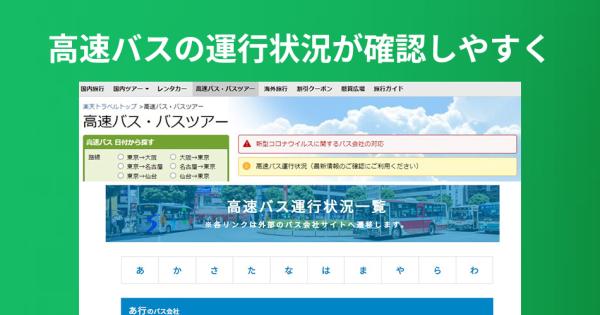 高速バスの運行状況が確認しやすくなりました 2019/04/25 楽天トラベルでは、お客さまより頂いたご意見・ご要望を真摯に受け止め、より良いサービスを提供できるよう、日々改善に取り組んでいます。このページでは、お客さまの声をかたちにした改善事例の一部をご紹介いたします。