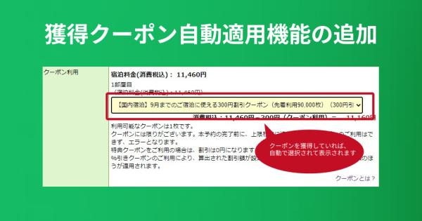 獲得済みクーポンが自動的に予約に適用されるようになりました 2020/06/25 楽天トラベルでは、お客さまより頂いたご意見・ご要望を真摯に受け止め、より良いサービスを提供できるよう、日々改善に取り組んでいます。このページでは、お客さまの声をかたちにした改善事例の一部をご紹介いたします。
