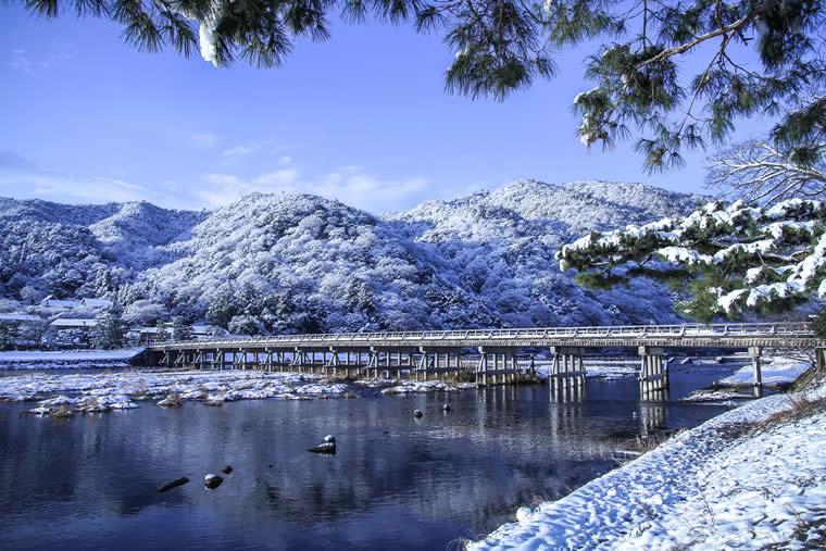 京都では貴船神社以外でも、雪が積もることも。京都市内平野部では年数日と多くはありませんが、金閣寺や嵐山などでも雪化粧した姿を見られることがあります。ただ、お昼頃には雪が溶けることが多いため、朝早い時間に出かけるのがおすすめです。