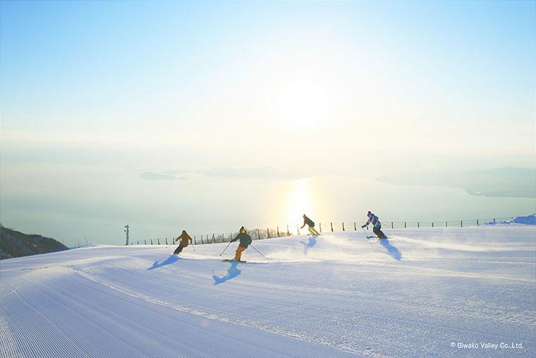 「びわ湖バレイ」は、琵琶湖を見下ろしながらスキー・スノーボードが楽しめるのが魅力。絶景スポットとして人気のウッドデッキやカフェ、ジップラインなどは冬期も営業しているので、スキー・スノボをしない人も楽しめます。