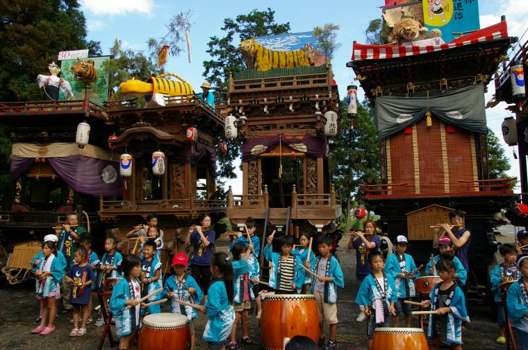 宵宮(前日)祭では松明(たいまつ)が奉納され、翌日は6基の曳山が町内を練り歩くことから、別名「曳山まつり」とも言われます。