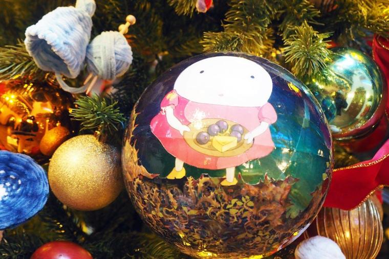 ここに来たら、ツリーのオーナメントにも注目してください。『パン種とタマゴ姫』のキャラクターをモチーフにした、ボールオーナメントやモール人形などが飾られていて、とっても個性的!