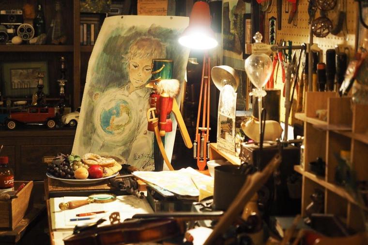 奥に進んだ「少女の部屋」も、見応えたっぷり。ずらっと壁に飾られているのは、この部屋で作業中の少女が描いたのかと思わせる、スタジオジブリ作品の背景画です。机の上には、絵の具やパレット、筆が転がり、ついさっきまで少女がいたかのよう!