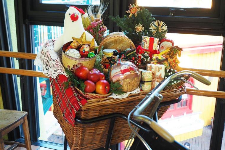 エレベーター横には、たくさんの心温まるアイテムをカゴにのせた、クリスマス仕様の自転車がスタンバイ。さまざまなツリーオーナメントに、パン種くんに、クリスマスプレゼントまで!ツヤツヤのリンゴもおいしそうです。
