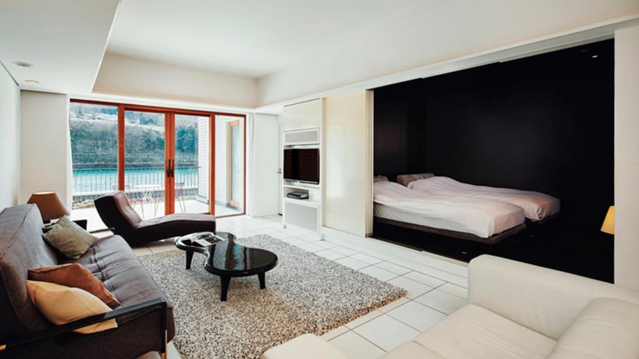 たった1人の手で3年もの歳月をかけて掘られた、日本でここだけにしかない海洋深層水のお湯が自慢の「洞窟風呂の宿 百楽荘」。全16室のうち、バルコニーや広縁が付いた部屋タイプ「鶴齢」や「游」なら、貸切露天風呂を無料で利用可能。プライベートな空間で、地下約350メートルから汲み上げたミネラル豊富で優しい肌触りの湯を楽しめます。