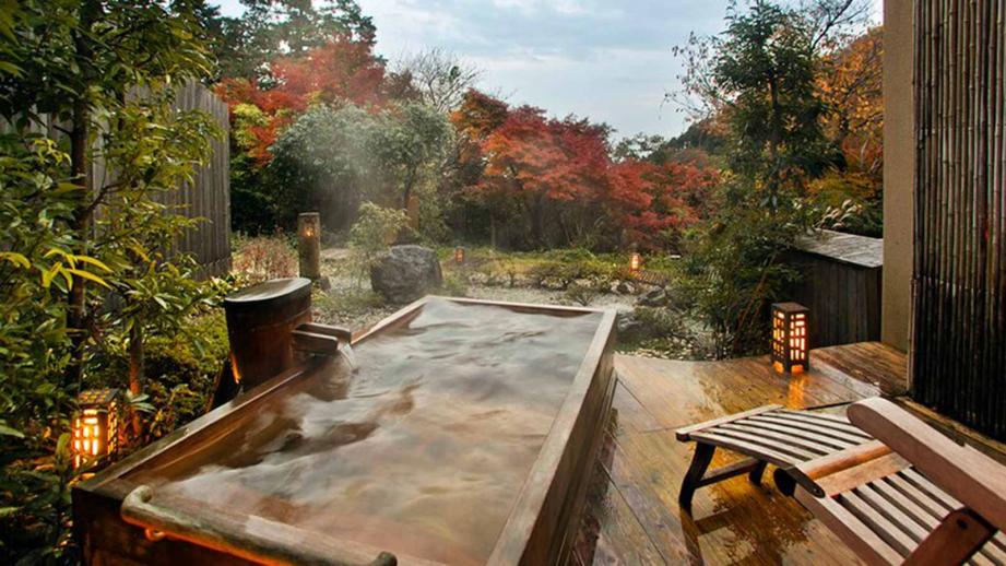 山の中に佇む「蒲郡温泉 天の丸別邸 風の谷の庵」は、静寂に包まれた離れ宿。森林浴を楽しみながら日常を忘れて癒しの時が過ごせます。客室はダイニング、囲炉裏、メゾネット、ホームシアターといった特別な仕様を備えた4タイプを用意し、全室に潤い豊かな蒲郡の天然温泉に親しむ専用露天風呂が付いています。